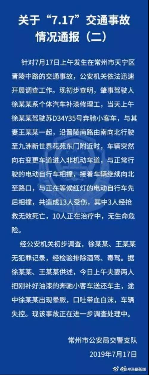司机晕厥导致3死10伤!警方通报常州奔驰撞人事件 17日,江苏常州闹市区,一奔驰车连撞多辆电动车,目前已致3死10伤。据常州警方通报,经初步调查,肇事驾驶人徐某某、其妻王某某无犯罪记录,排除酒驾、毒驾。据二人供述,他们是将刚补好漆的奔驰小客车送还车主,途中徐某某出现晕厥,口吐带血白沫,车辆失控。(@常州交警在线)