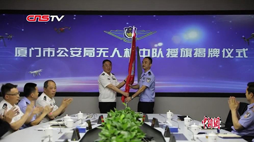 今年4月26日,厦门市公安局领导为无人机中队授旗,并与大疆创新科技有限公司签订战略合作协议,共同为“无人机警务实战联合创新实验室”揭牌,集美大学信息工程学院和市公安局各警种的民警代表也参加了仪式。