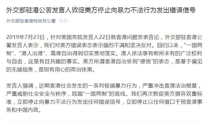 2019年7月23日,针对美国务院发言人22日就香港问题发表言论,外交部驻香港公署发言人表示,我们对美方错误表态表示强烈不满和坚决反对。回归以来,“一国两制”、“港人治港”、高度自治得到切实贯彻落实。港人依法享有前所未有的广泛权利与自由,这是有目共睹的事实。美方所谓香港自治受到“侵蚀”的表态,是基于偏见的无端指责,是别有用心的政治抹黑。