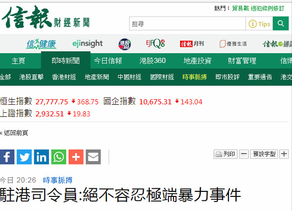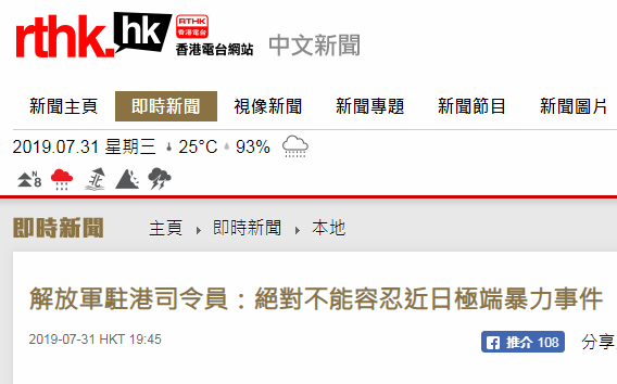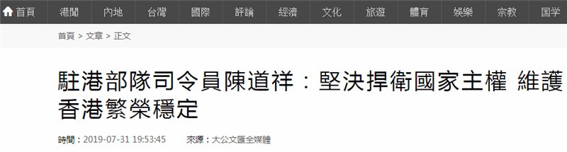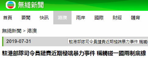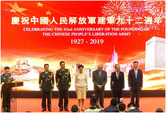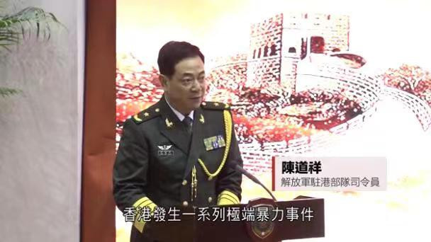多家香港媒体消息,解放军驻港部队司令员陈道祥参加庆祝解放军建军92周年招待会时,针对近期香港发生一系列极端暴力事件表态,批评这些暴力事件“严重破坏了香港繁荣稳定的大局,严重挑战了香港法治和社会秩序,严重威胁到香港市民的生命财产安全,也严重触碰了‘一国两制’的原则底线,绝对不能容忍,我们对此表示强烈谴责。”