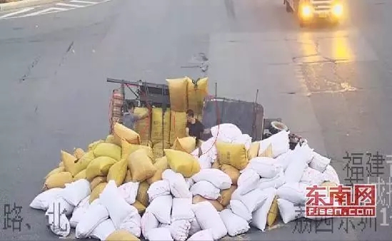 8月10日清晨5点多,在莆田市荔园路和东圳路交叉路口,一辆满载着谷糠的农用三轮车,在通过红绿灯路口时突然失控,车载的上百袋谷糠连车翻倒。顷刻间,车上的一对老夫妇被上百袋谷糠掩埋。