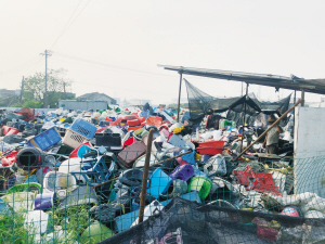 “这也是此次执法行动开展以来我们发现的较为触目惊心的现象了。”负责该区域巡查工作的执法人员指着无序堆放的垃圾说。根据现场情况,执法人员基本判断此处至少有4个非法废旧塑料加工点。在距离“垃圾山”最近的加工点内,可以看到成片的废旧塑料中摆放着一套用来进行切割、粉碎、清洗等塑料处理工艺的设备,其中包含一个水体浑浊的清洗池,池子下方未采取任何纳管和防渗措施,任由清洗废水直接排入,渗漏进土壤内。“这个情况是比较严重的,它会对土壤产生永久性的破坏,而且废旧塑料的成分非常复杂,里面还有可能含有重金属或者其他会产生进一步污染的化合物。”执法人员告诉记者。