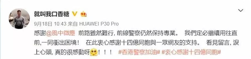 “前路虽然难行,前线警察仍然保持专业,我们必定继续勇往直前,一同冲出困境”,账号为“就叫我口香糖”的香港警察张Sir在一条微博中写道,“衷心感谢14亿同胞与一众网友的支持。看见留言,泪上心头,真的很感动。”↓