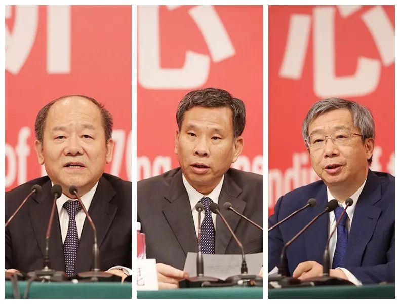 图为国家发展和改革委员会副主任、国家统计局局长宁吉喆(左),财政部部长刘昆(中),中国人民银行行长易纲(右)介绍相关情况并答记者问。