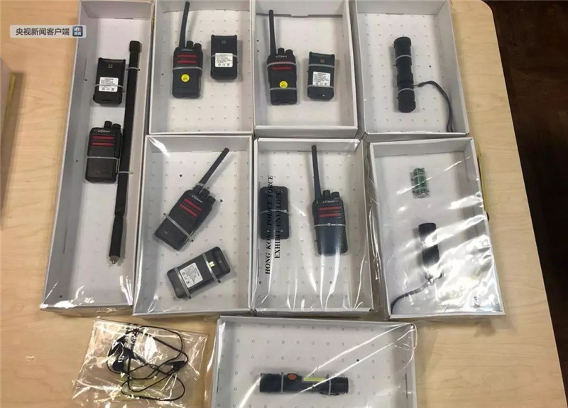 香港警方2日傍晚发布消息称,2日上午6点半左右,观塘警区警务人员在港铁油塘站对面一带巡逻时发现三男一女形迹可疑,上前截查。调查期间,在他们身上检获一批怀疑攻击性武器,包括四支激光笔、护目镜、面具、口罩、胶索带、黑色衣物、电筒、手套、对讲机、望远镜及一把约五十厘米长的铁锤等。